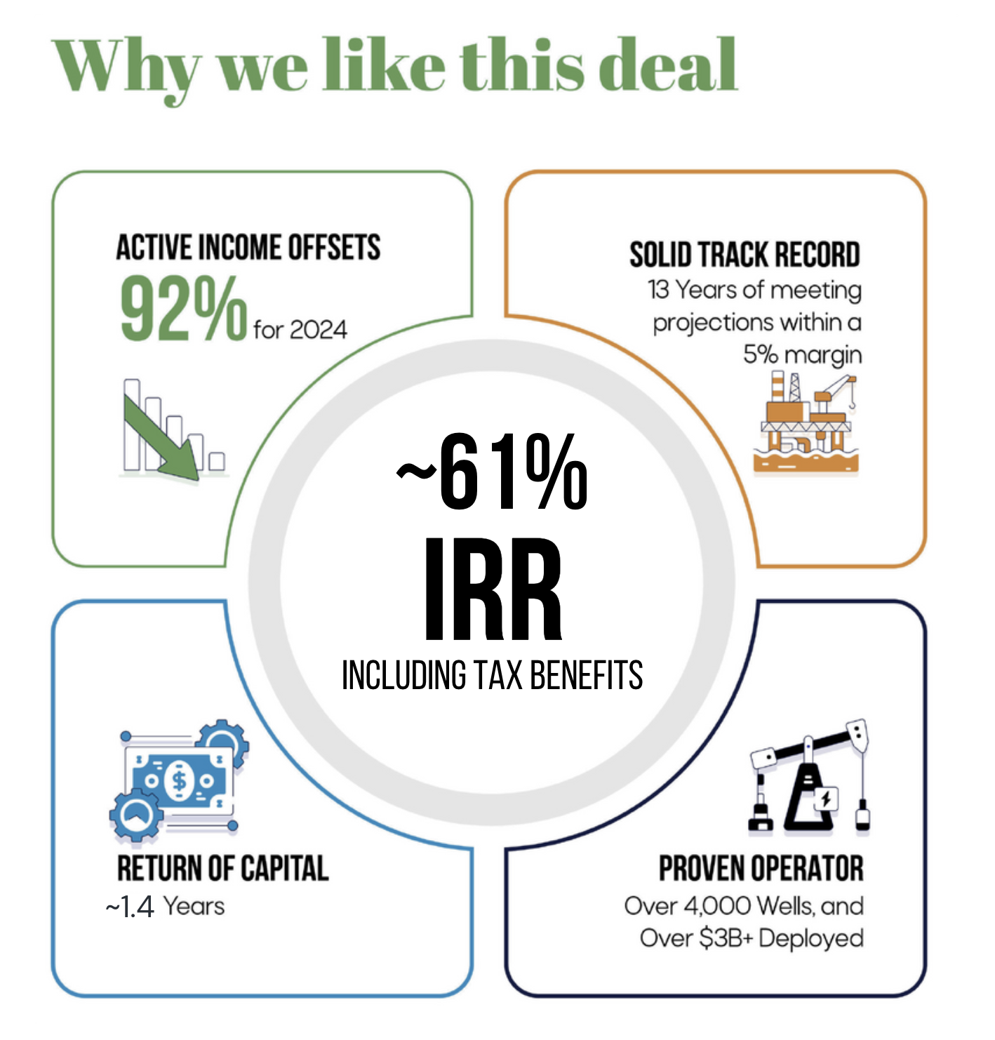 For all investors, approximately 15% of the gross income is tax free as a result of the Depletion Deduction under current tax code provisions. Depletion will be allocated amongst the investors based upon their interest in partnership revenues.
